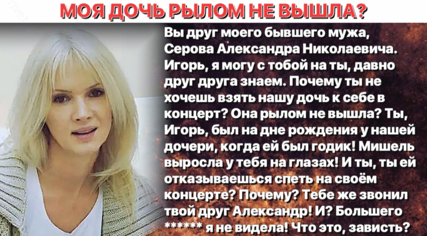 Обострение произошло после того, как Елена Стебенева выступила с резкими заявлениями в публичном пространстве. В своих публикациях она обвинила Игоря Крутого, давнего знакомого семьи и коллегу по музыкальной среде, в предвзятом отношении к Мишель. По словам Стебеневой, композитор якобы проигнорировал личную просьбу девушки о создании песни и не дал ей возможности появиться на одной из престижных концертных площадок. Эти действия мать певицы расценила как несправедливость и недооценку таланта дочери, что и стало причиной эмоционального отклика, вызвавшего широкий резонанс в светских кругах и социальных сетях.