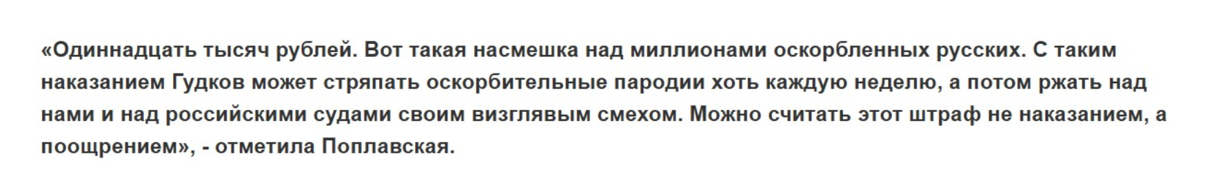 Поплавская же была недовольна решением. Она просто вне себя от возмущения. Считает, что Гудков оскорбил всех русских, поэтому наказание должно быть более строгим. Тем самым сделать урок для остальных, чтобы никто не подумал больше ничего подобного вытворять.