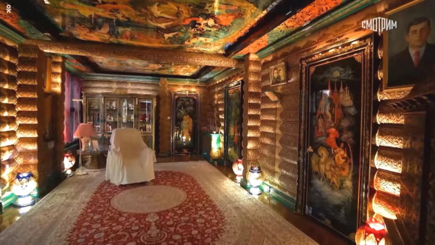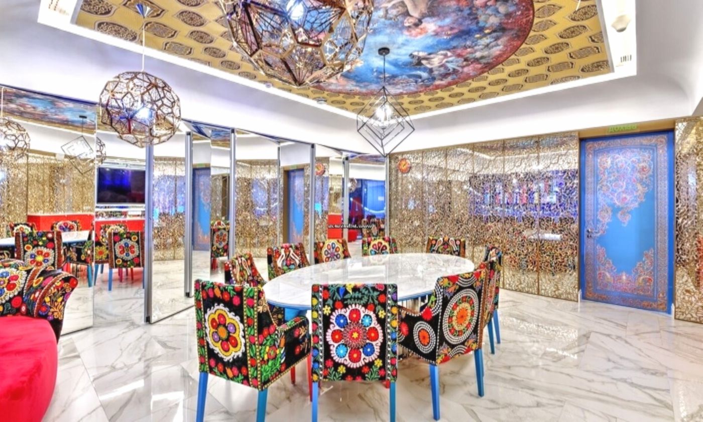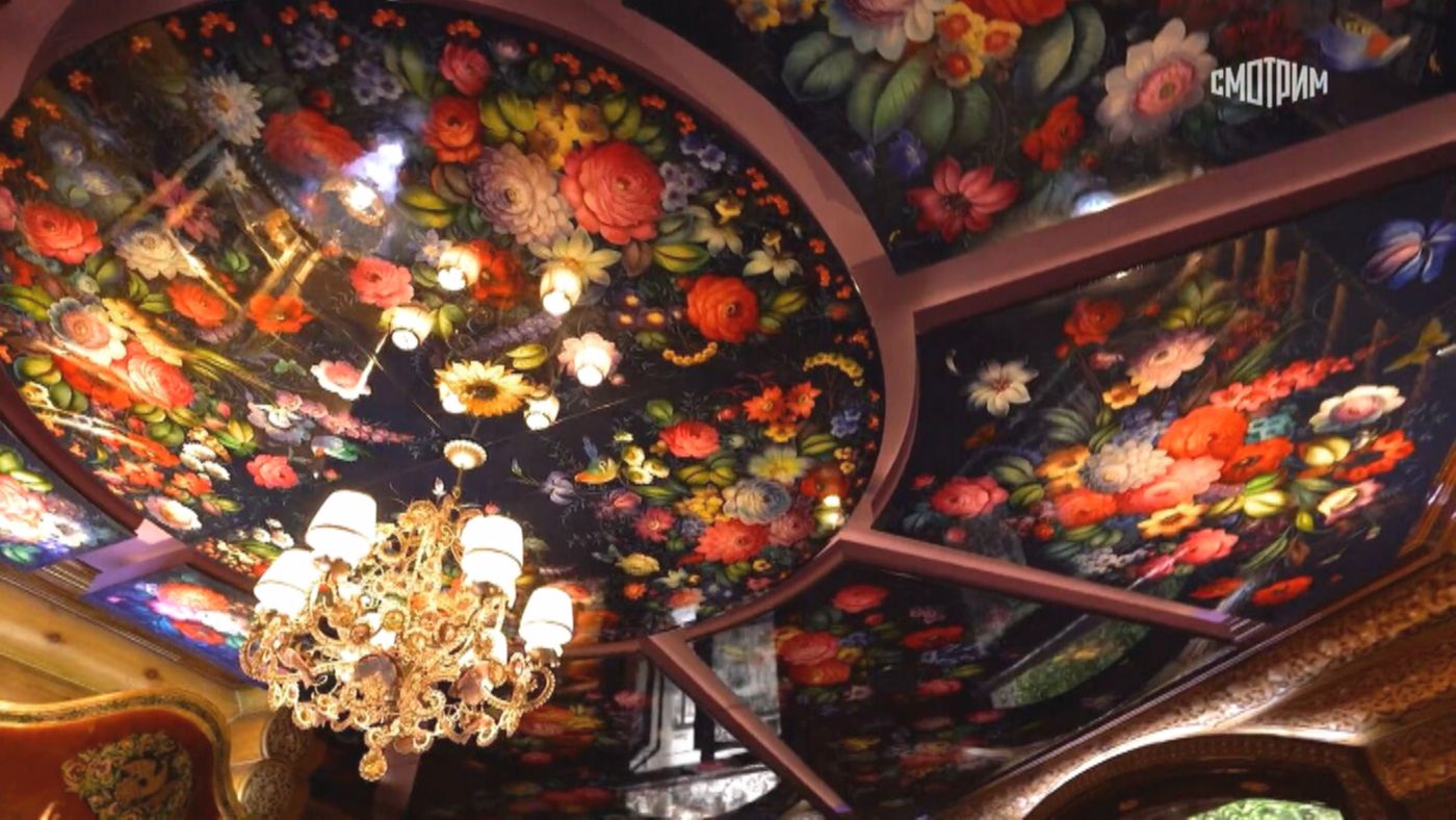 Интерьер особняка — это гармоничное сочетание традиций Узбекистана и русских народных промыслов. Здесь можно увидеть ткани с яркими, насыщенными узорами, резьбу, золотые элементы и декоративные детали ручной работы. Мебель украшена хохломой, гжелью и ростовской финифтью, а стулья, с вышитыми узорами, стали настоящей гордостью хозяйки. На стенах висят панно из китайского шелка, а среди других элементов интерьера — работы ее отца, известного узбекского художника Александра Винера.