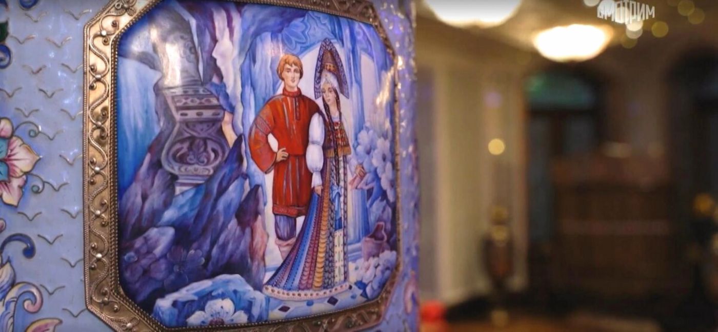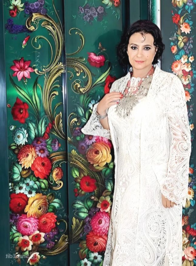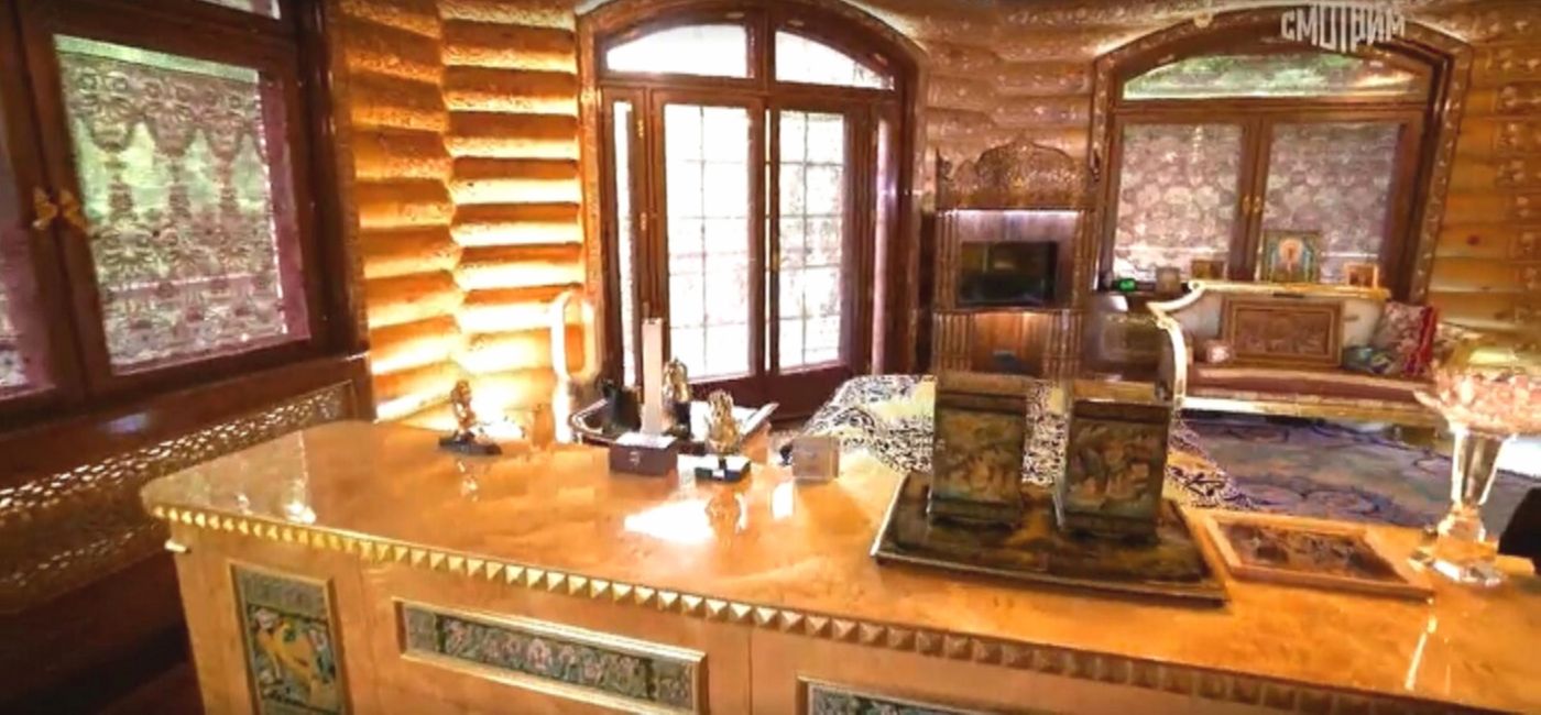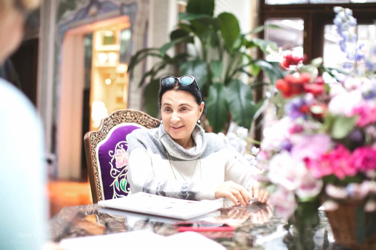 Интерьер особняка — это гармоничное сочетание традиций Узбекистана и русских народных промыслов. Здесь можно увидеть ткани с яркими, насыщенными узорами, резьбу, золотые элементы и декоративные детали ручной работы. Мебель украшена хохломой, гжелью и ростовской финифтью, а стулья, с вышитыми узорами, стали настоящей гордостью хозяйки. На стенах висят панно из китайского шелка, а среди других элементов интерьера — работы ее отца, известного узбекского художника Александра Винера.