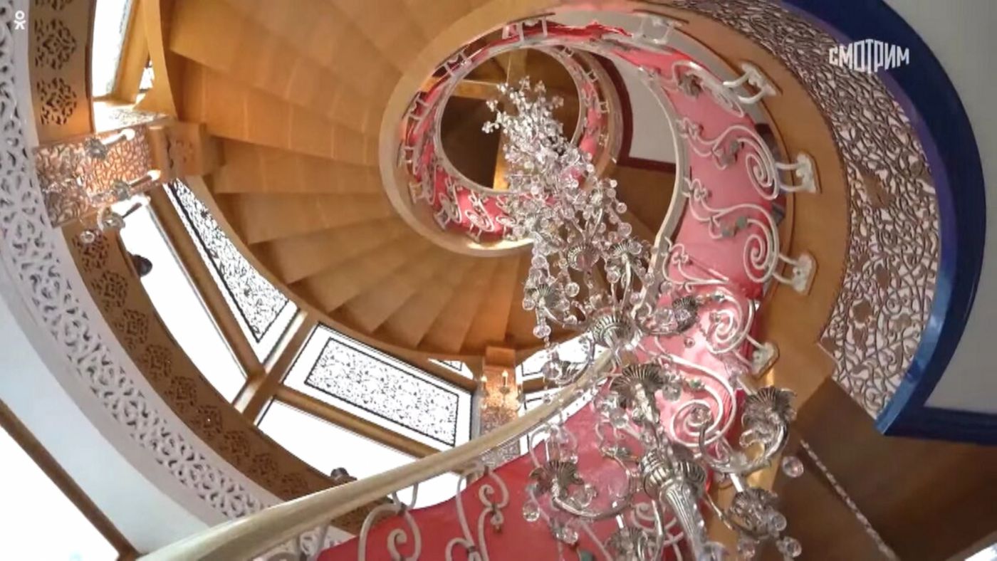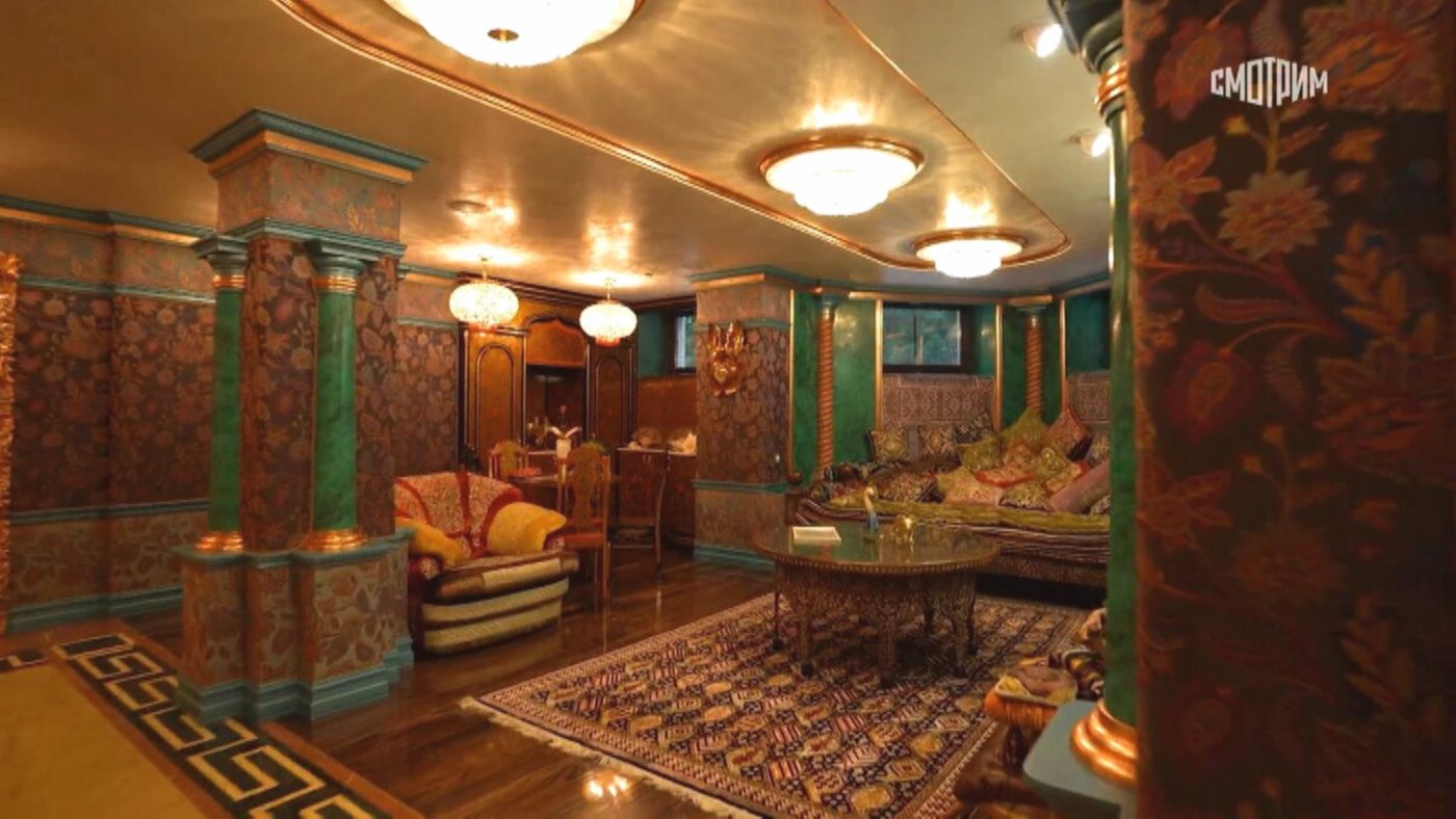 Процесс создания интерьера был под чутким руководством дизайнера Игоря Соловьёва, которого связывают с проектированием Дворца гимнастики в Лужниках. Работая вместе, они нашли идеальный баланс между изысканной восточной пышностью и европейской сдержанностью. В доме нет ощущения перегруженности, несмотря на множество ярких декоративных элементов. Каждая деталь продумана таким образом, что пространство выглядит гармоничным и уютным, где узбекская резьба органично соседствует с русскими традициями и европейскими акцентами. Даже ступени лестницы украшены утонченным орнаментом.